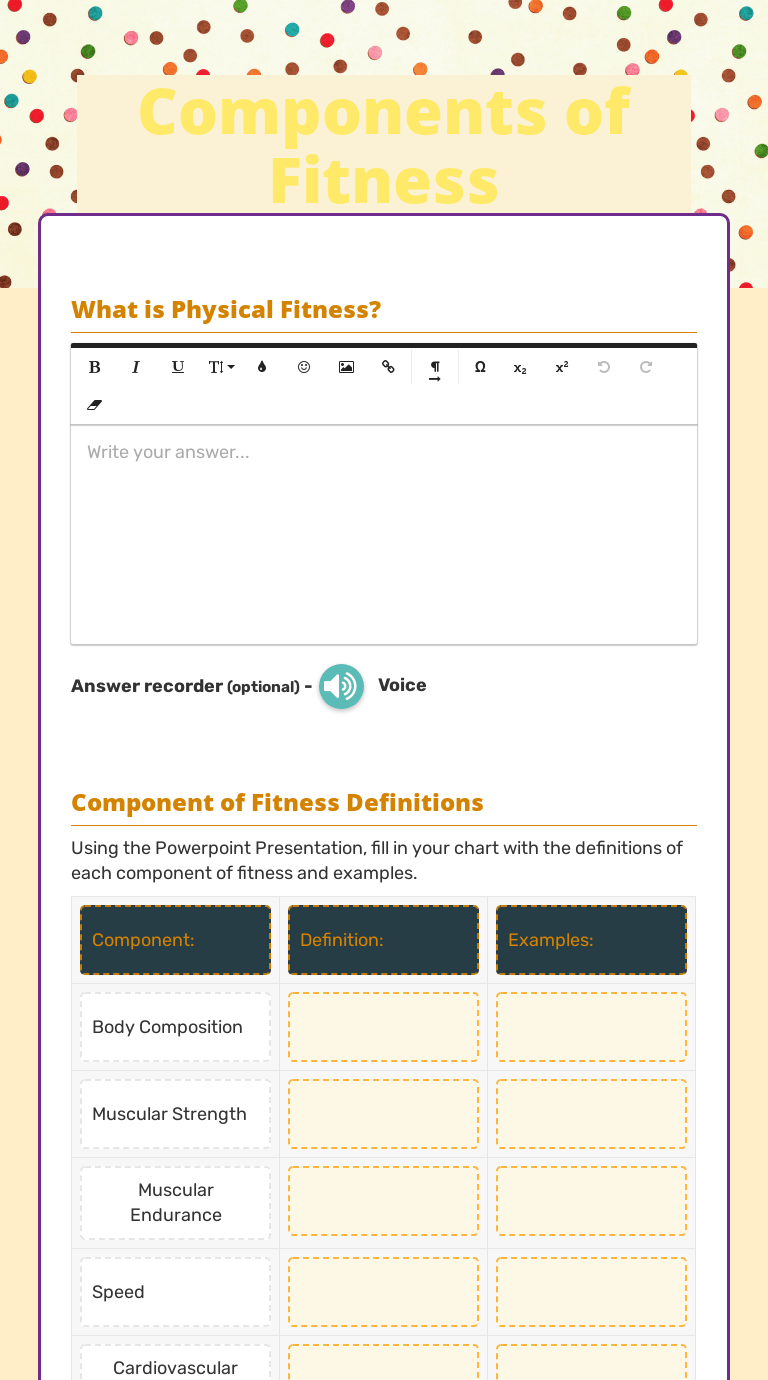 What are components of fitness? components of fitness worksheet. Learn vocabulary, terms, and more with flashcards, games, and other study tools.